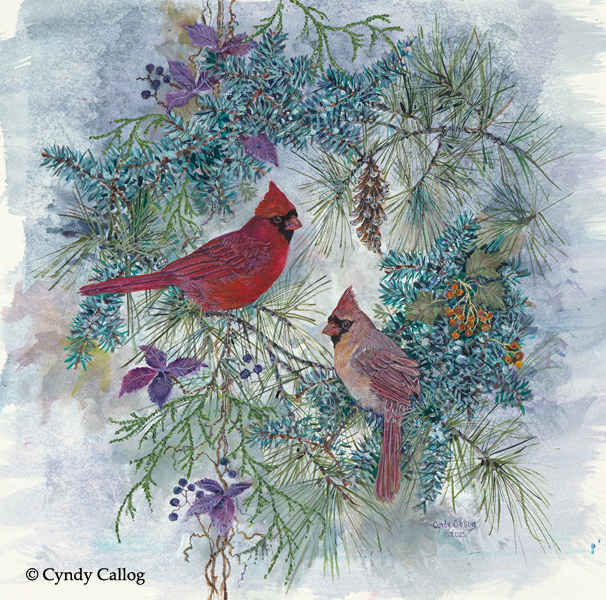 "Christmas Cardinals with Wreath"